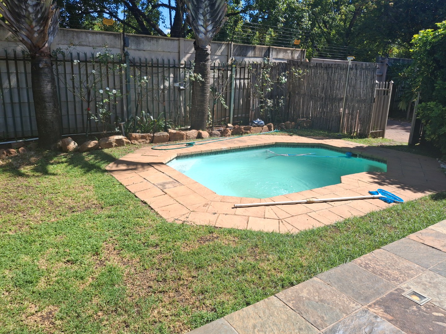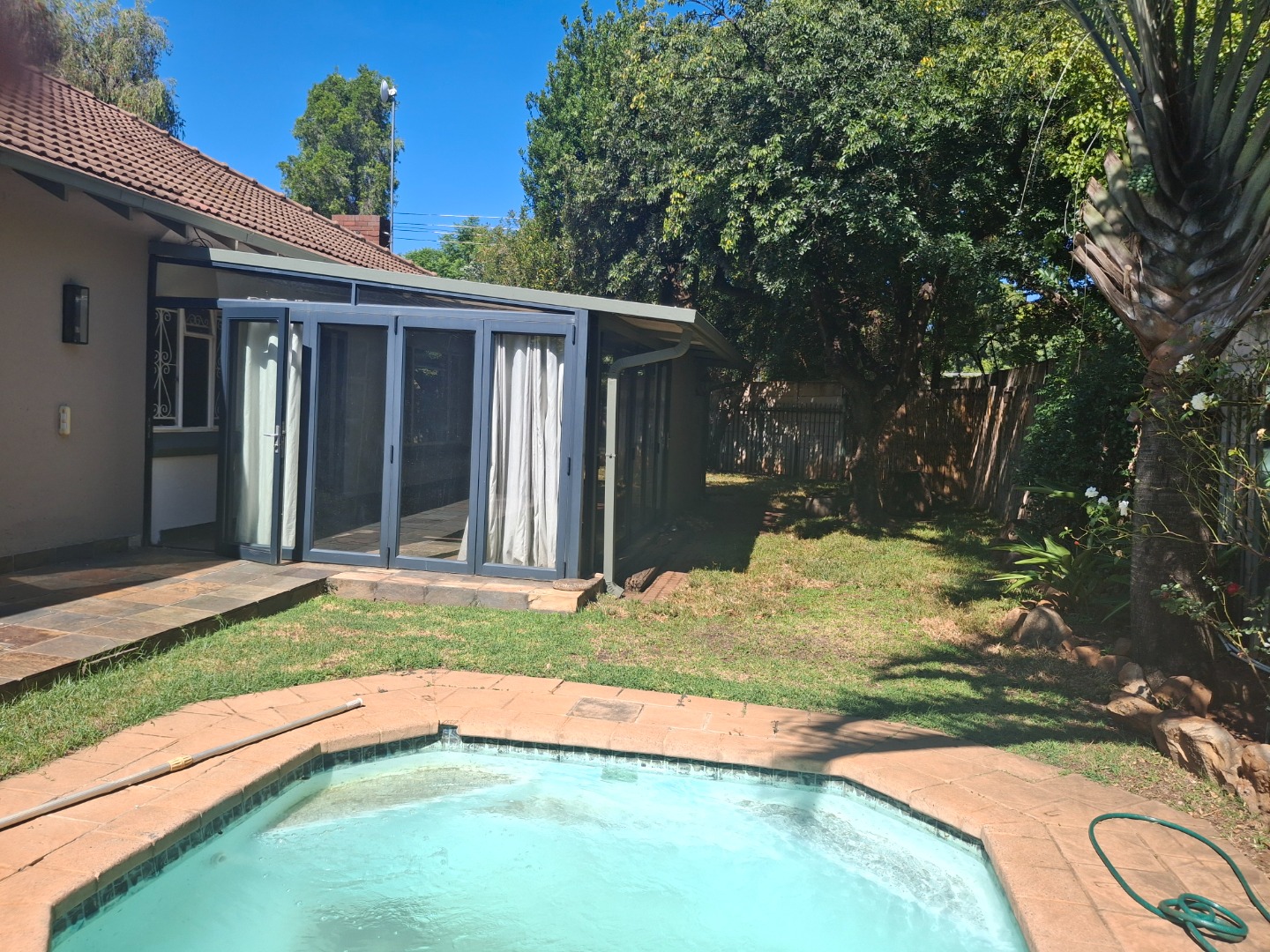 Step outside to a private oasis designed for outdoor living. The property includes an enclosed patio, perfect for all-weather entertaining, featuring a built-in stone braai and large glass doors that open directly to the private swimming pool and garden. With two garages and two additional parking bays, there is plenty of secure space for vehicles. This pet-friendly home is also fibre-ready and benefits from central heating, ensuring comfort and connectivity.